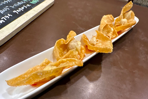 タイ料理でよく使われるスイートチリソースの上にパリッと香ばしく揚げられた肉ワンタンが置かれている。今回のヒット料理!中華ビアホールならではの逸品だ。