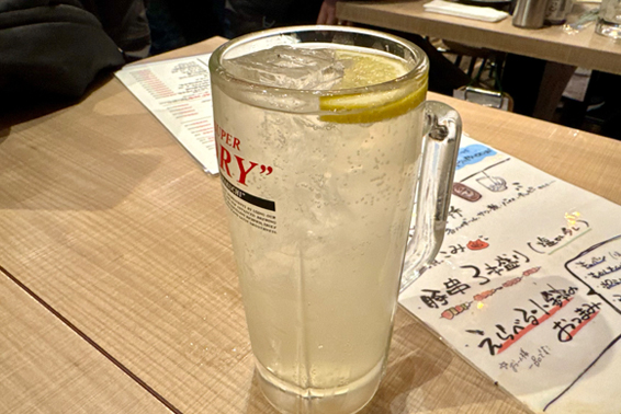 まずは「生しぼりレモンサワー」からスタート。正直なところ「生しぼり」感は良く分からないが、普通に美味い。他に「鬼塩レモンサワー」「広島県ブルーレモンサワー」「ゆずハチミツレモンサワー」が同じ値段で飲める。これらも非常に気になる。