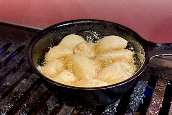 メニューの「ニンニク」の文字を見ると注文せずにはいられない。小さなフライパンに入ったニンニクを網の上に乗せて溶けたバターでグツグツ煮てからお皿に戻して食べる。ホクホクしたニンニクが美味い!最高ーっ!