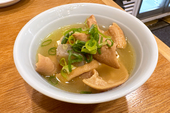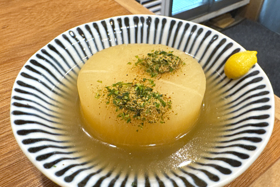 まだ食べたことのない貝出汁のおでんが気になり、「大根」を注文。ひと口かじると、貝の旨みをたっぷり含んだ出汁がじゅわっと広がり、思わずうなる美味しさだ。おでんの四番打者とも言える大根がこれだけ完成度高いとなると、他の種にも期待が膨らむ。今回はそこまで辿り着けなかったが、次回はぜひいくつか試してみたい。