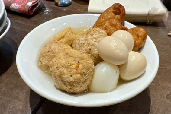「お通し」は「ミニおでん」。やさしい味付けで美味い!かなり満足度の高いお通しだ。料理が来るまでの間、これで十分に酒が楽しめる。