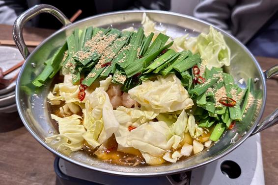店員さんからオススメされた「もつ鍋」。「白」「黒」「黄」と3種類あって、それぞれの味は「にんにく塩」「焦がし醤油」「病みつきカレー」になっている。今日は「黒 焦がし醤油」を選択した。野菜がしんなりして、しばらくグツグツさせたところで食べ頃。トゥルトゥルのもつが口の中でとろける。同時に野菜もたっぷりと食べられ身体も温まる。それにしても、この「焦がし醤油」は美味い♪