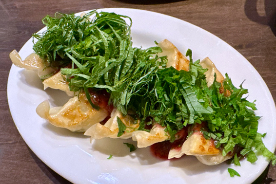 看板メニューである餃子はいろいろな種類があるが、その中から「梅しそ餃子」を注文してみた。餡の中に梅しそが入っているのかな…と思ったらそうではなくて、餃子の上に梅ソースと大葉がたっぷりとかけられていた。梅の風味と酸味でさっぱりと食べさせてくれる創作餃子だ。