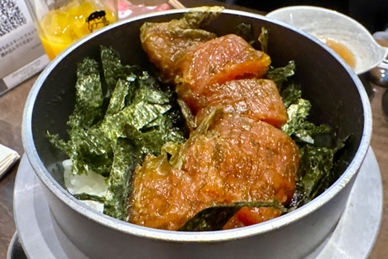 〆は「博多明太子飯」。注文が入ってから、小さな釜で炊き上げるので、出来上がりまで40分ほど掛かる。たっぷりの明太子と海苔が、ふっくらごはんと良く合う。そのまま食べるのも良いが、お茶漬けでも食べたい気がする。