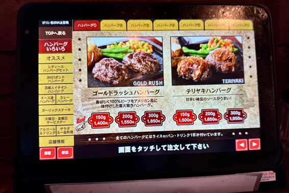 芸能人のオススメ的なメニューもあったが、ここはまず基本の「ゴールドラッシュハンバーグ」を注文した。グラムが150・200・300・1ポンドから選べたが、今日は控えめに300グラム+ライス普通にした。