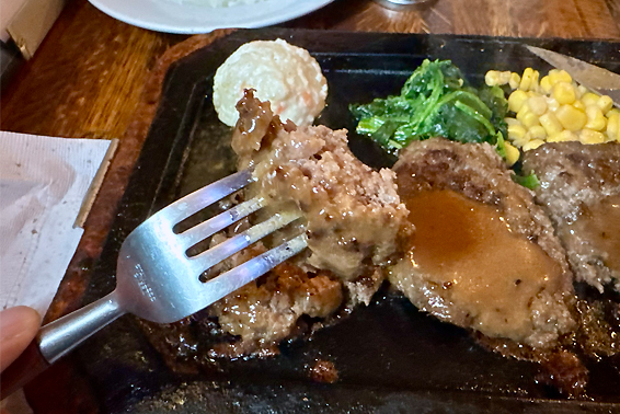 10分ほどでジュージュー音を立てながらハンバーグが出てきた。店員さんがソースを掛けると、ソースが鉄板に弾ける音と湯気が上がる。ソースのグツグツが収まるのが待ち遠しい。