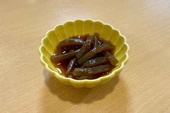 予約をするとお通し代400円が掛かるらしい。…と言うことは、今回は予約をしなかったので無料なのか?と思うが、確認するのを忘れた。今日の「お通し」は甘辛く煮られたこんにゃく。普通に美味い。