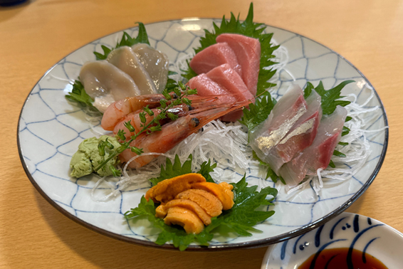 普通の「おまかせ五点盛り合わせ」(1800円)と迷ったが、せっかく来たのだから…と、「上」の方を注文した。中トロ、海老、ウニの他は平貝としまあじだと説明してくれた。見た目のドカン!としたボリュームはないが、一品一品吟味されている印象だ。その落ち着いた佇まいに期待値が上がる。
