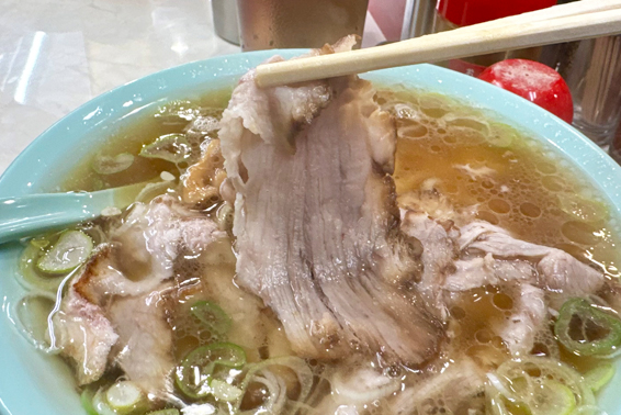 これでもか!と敷き詰められたチャーシューは薄切り。オーダーが入ってから切り分けられるので柔らかくて瑞々しい。普通でこの量ならば、チャーシュー麺はどうなってしまうんだろう。是非ともオンザライスで食べたいチャーシューだ。