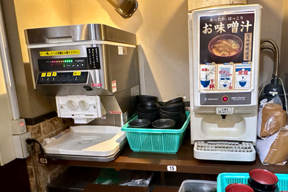 ステーキが焼き上がると番号で呼ばれる。その間にごはんと味噌汁を準備する。