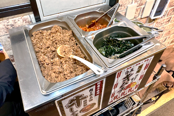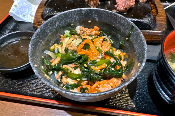 さらに、ごはんのお供の充実がすばらしい。「牛しぐれ」「キムチ」「わかめナムル」「野沢菜&べったら漬け」が食べ放題だ。たとえステーキを食べ終えても、これだけでも、あと何杯も食べられてしまう。