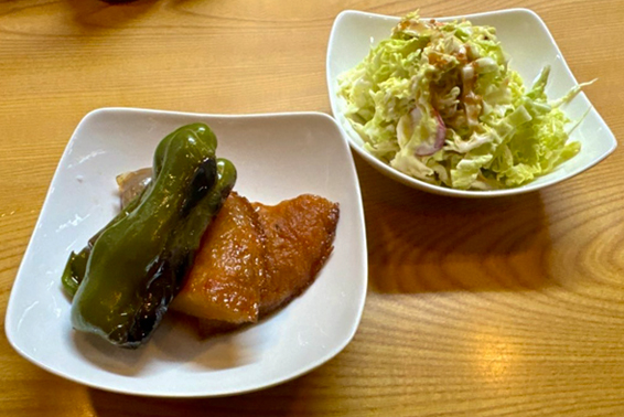山盛りのサラダと、さつま揚げとピーマンの煮物が提供された。特に煮物は甘めの味付けで、家庭的ながら完成度が高い。軽い気持ちで箸を伸ばしたが、そのあまりの美味さに、最初のひと皿で、この後の料理への期待が一気に高まった。