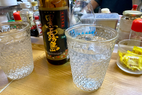まず、焼酎ボトルをキープ。その後、大きなグラスに氷を入れてもらい、自分で焼酎と炭酸水を注いで飲むのが「坂ちゃん」流だ。ドリンクメニューはないので、焼酎ボトルがいくらなのか、炭酸水がいくらなのか、氷がいくらなのか分からない…が、そんなに高くないことは確か。