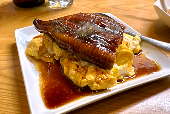 玉子を五個使ったふわふわの玉子焼きの上に、うなぎがドーン!と乗っている。うなぎも玉子焼きも大好きなせんベロからすると、これは夢のタッグの実現だ。口の中が幸せになる。