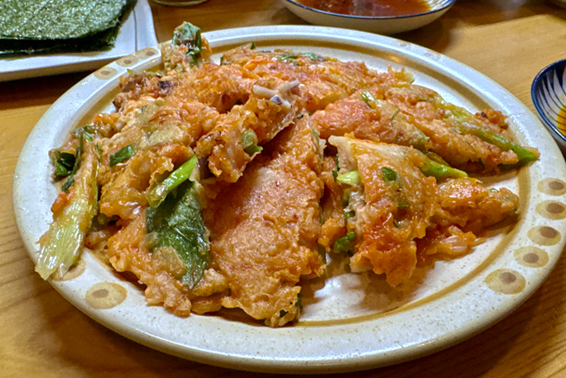 キムチとネギがたっぷり入ったチヂミは、もちもちとした食感が特徴。タレにくぐらせ、海苔で巻いて食べるのがこの店の流儀。美味い!…が、これもひとりでは食べきれない。