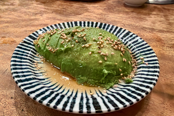 カットされたアボガドにごま油と塩を振ったシンプルな一皿だが、これがなかなか侮れない。ねっとりとしたアボガドのコクに、ごま油の香ばしさと塩気が絶妙に合う。酒のつまみとしても十分に成立している。