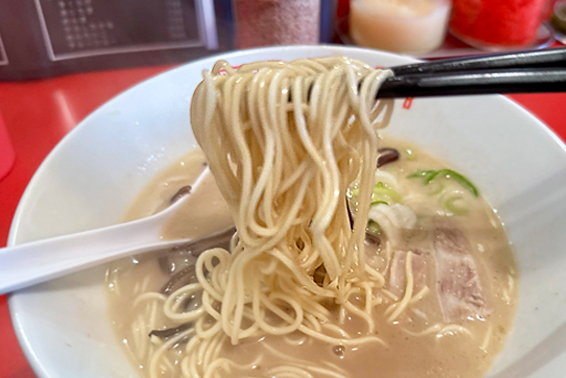 麺はばりかたで注文。歯ごたえのある食感が心地よく、濃厚な豚骨スープに負けない存在感がある。スープはとろりとクリーミーで、臭みはなく旨味だけが広がる。ひと口目から店名に納得。